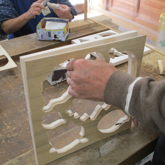①板に下絵を貼ります。ドリルで鋸刃をさす穴を開けます。線に沿って糸のこで切ります。