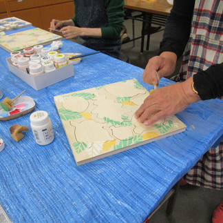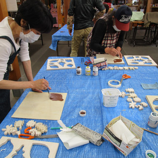 ⑤切り抜きを入れた板の表面に、ステンシル技法で模様を入れます。