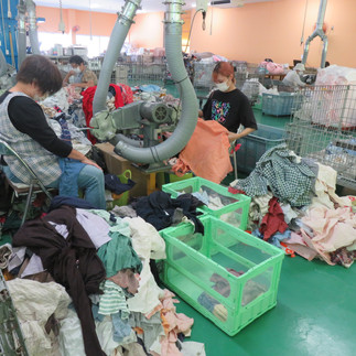 ベルトコンベアの上を衣類が流れてきます。1枚1枚人の手で、生地、子ども大人用、ズボンスカート、色など、60種200以上に分けられます。結構動きが早く、びっくりしました。